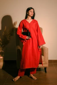Elevate your wardrobe with this refined 3-Piece Pret ensemble in a graceful Mauve Orchid shade. The lawn shirt is designed with a soft round V-neckline enhanced by subtle pleat accents, featuring a shorter cut and a beautifully embroidered rounded hem. Its relaxed sleeves are finished with scalloped embroidered borders, adding a touch of delicate craftsmanship. Complemented by an embroidered farshi shalwar and a fluid printed silk dupatta, this outfit blends classic sophistication with modern elegance for a truly polished look.